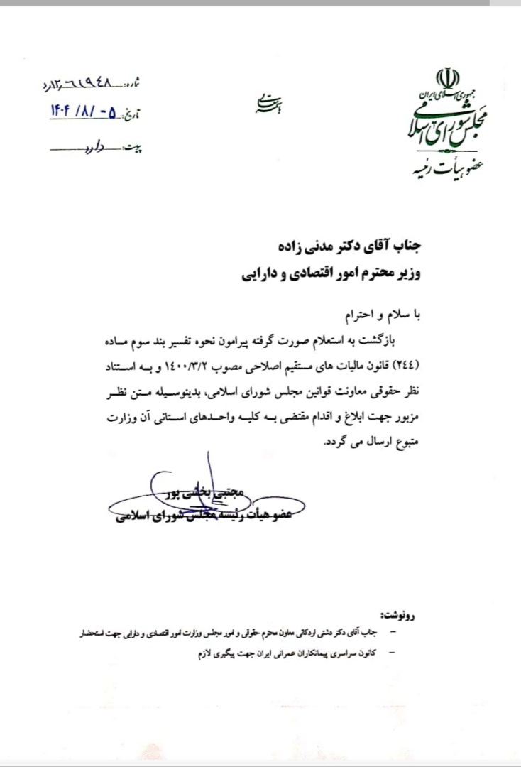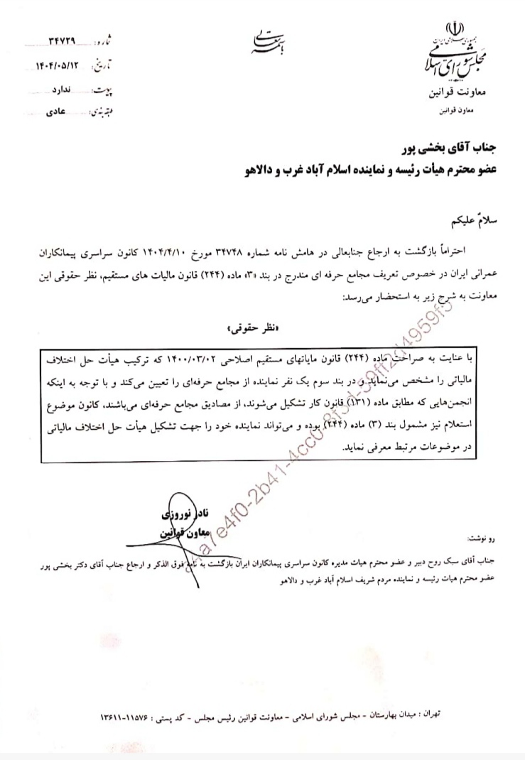 در رابطه با بند 3 ماده 244 قانون مالیات های مستقیم، دکتر بخشی پور (عضو هیئت ریئسه مجلس شورای اسلامی، رئیس کانون پیمانکاران عمرانی ایران و رئیس انجمن شرکت های عمرانی استان کرمانشاه) استعلامی را در خصوص نحوه تفسیر این بند انجام داده اند که در پاسخ نظر حقوقی معاونت قانون به شرح زیر می باشد: